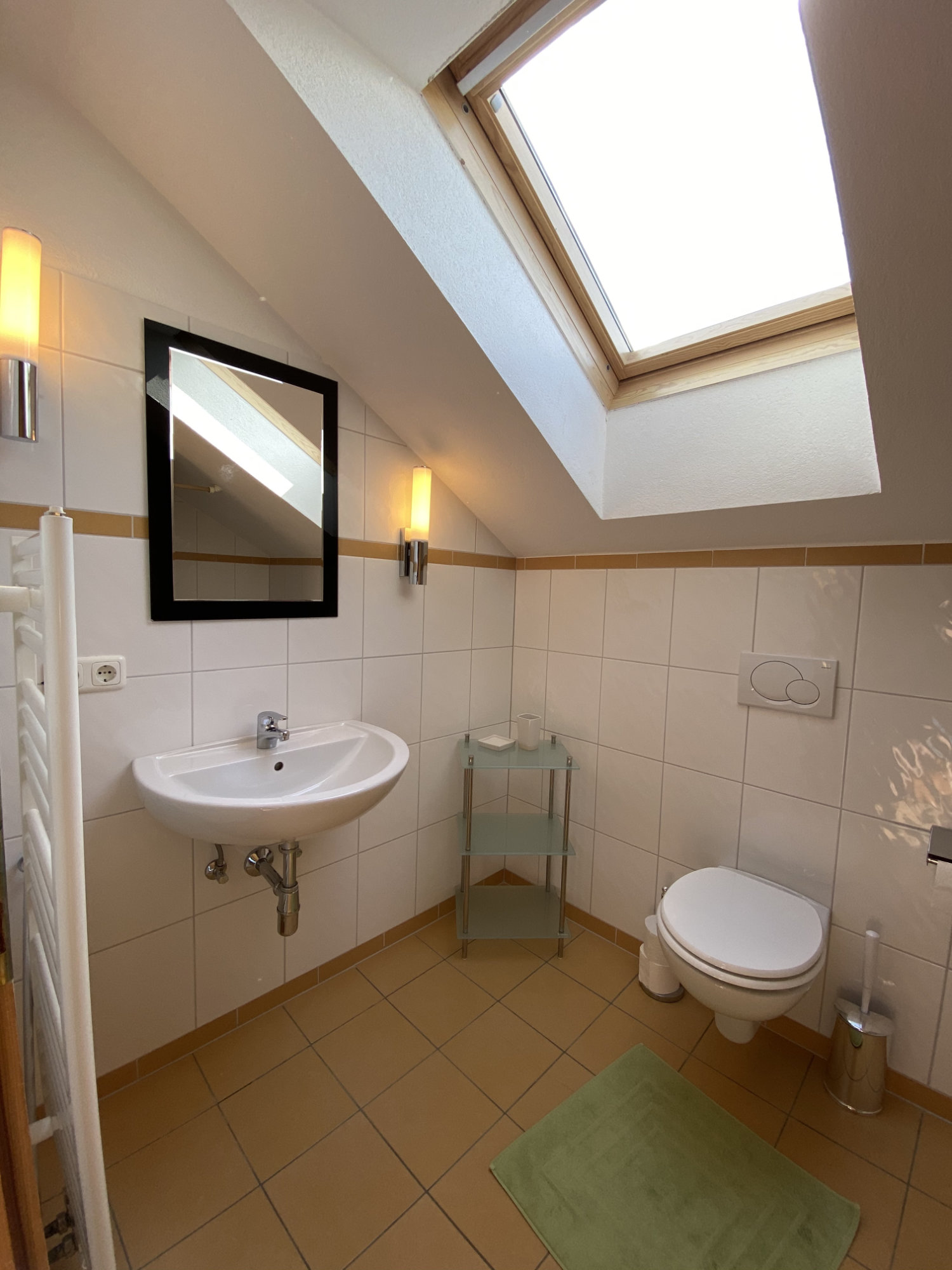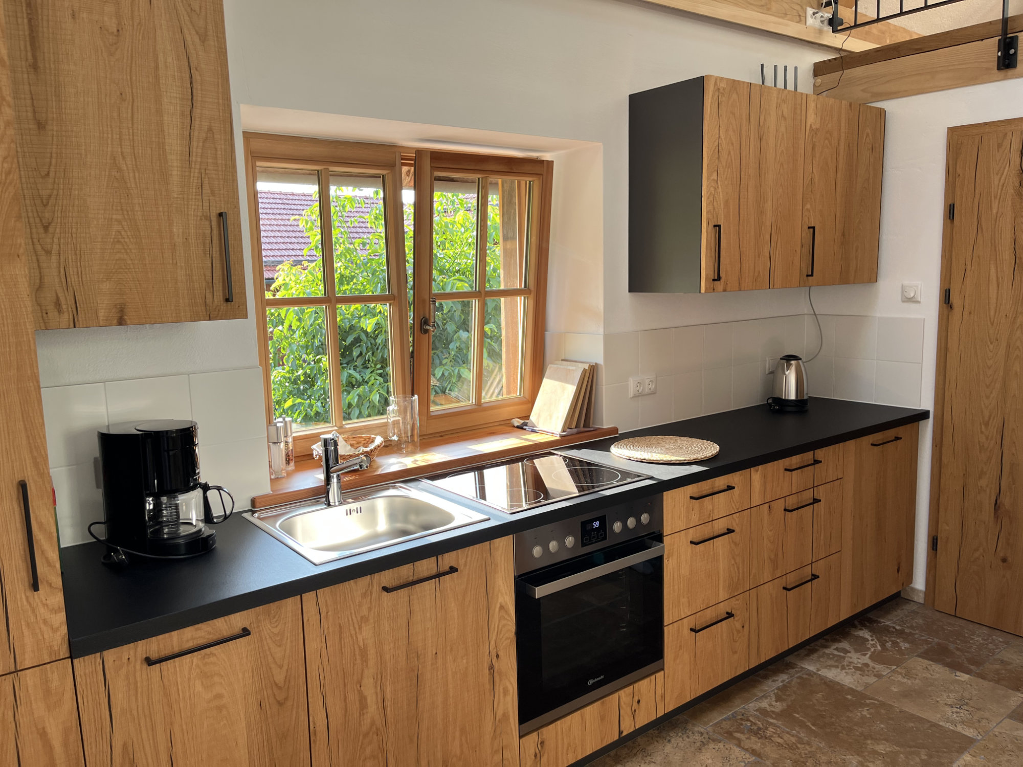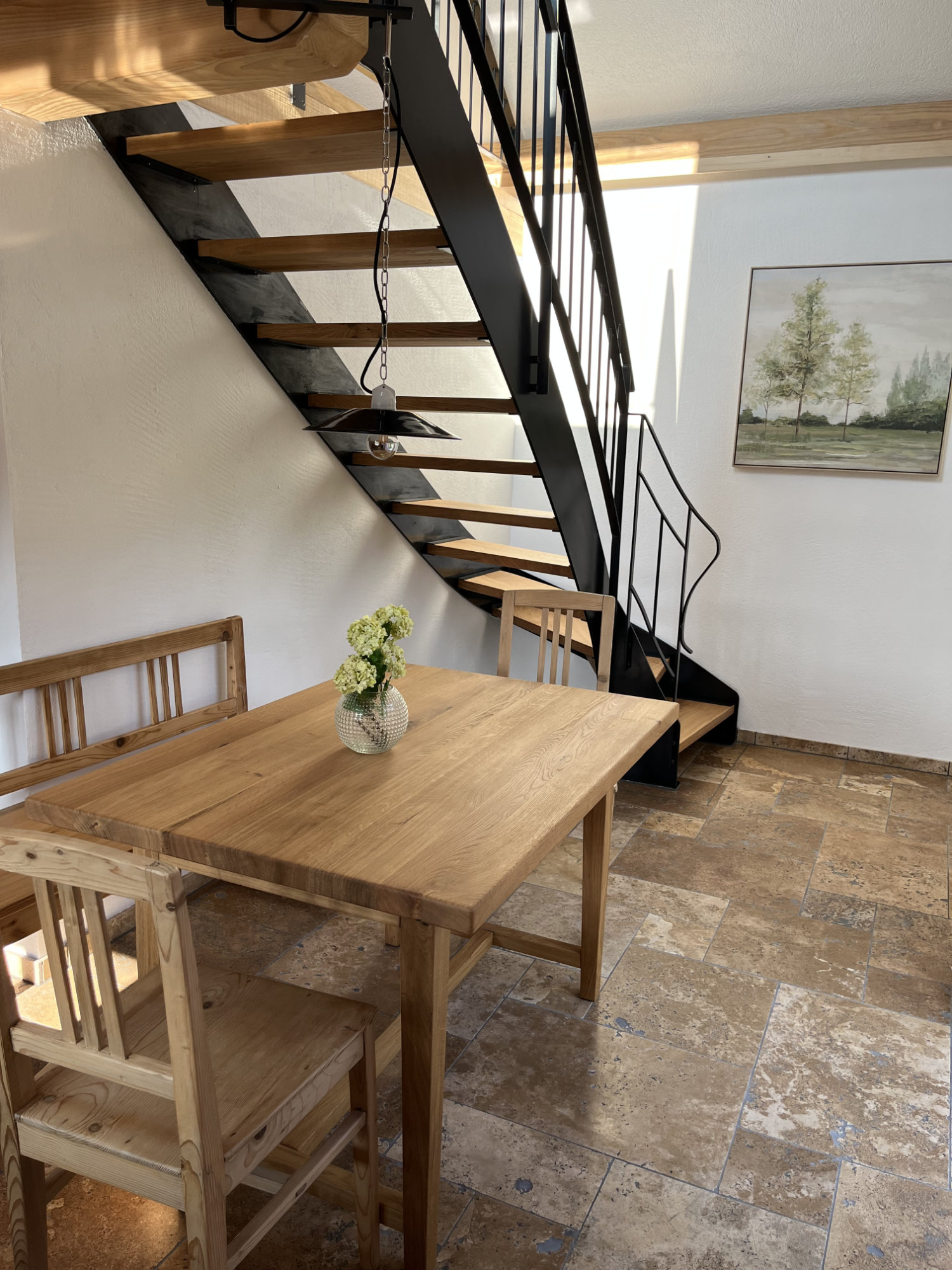 Die gemütliche Ferienwohnung „Gartengalerie“ bietet auf 50 m2 Platz für bis zu zwei Personen und ist ideal für einen erholsamen Aufenthalt zu zweit. Das Schlafzimmer in der Galerie ist mit einem Doppelbett, TV und einem Schreibtisch ausgestattet. Das Dachfenster ermöglicht Ihnen bei Nacht einen bezaubernden Blick auf den Sternenhimmel und sorgt so für besondere Momente zu zweit. Die voll ausgestattete Küche mit Essbereich lädt zu gemeinsamen Mahlzeiten ein. Das Badezimmer ist mit Dusche und WC komfortabel eingerichtet.Ein französische Balkon mit Blick auf den Obstgarten trägt zu einer ruhigen und einladenden Stimmung in der Wohnung bei.